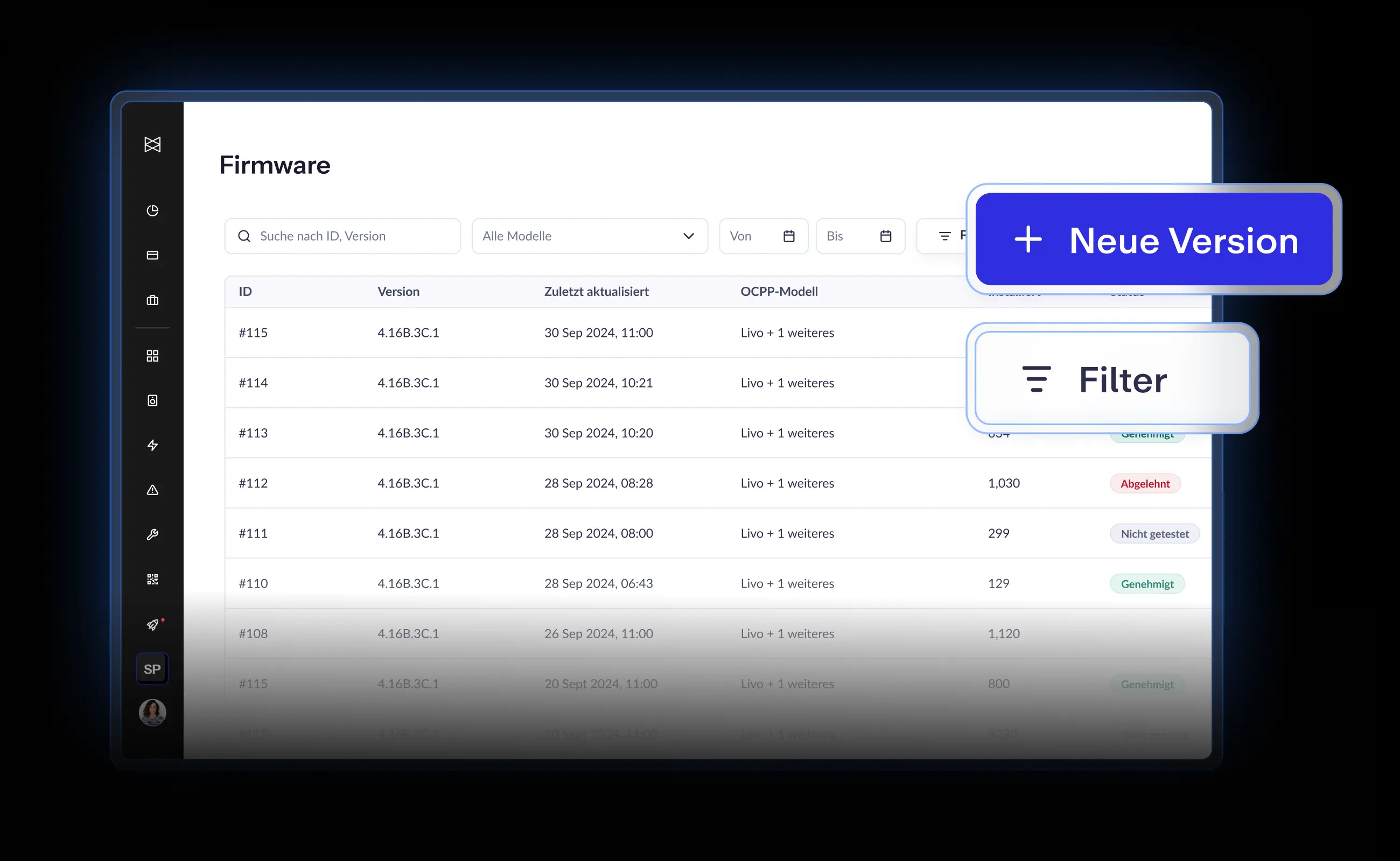 Optimiere deinen Firmwareprozess mit einer Softwarelösung, die alles organisiert und aktuell hält. Mit den Firmwareupdates unseres Portal kannst du einfach auf Firmwareversionen zugreifen und diese verwalten. Lasse dir die aktuellsten und ältere Versionen anzeigen, überwache deren Zustände (getestet, ungetestet oder abgelehnt) und lade neue Firmware zusammen mit ihren Metadaten hoch.