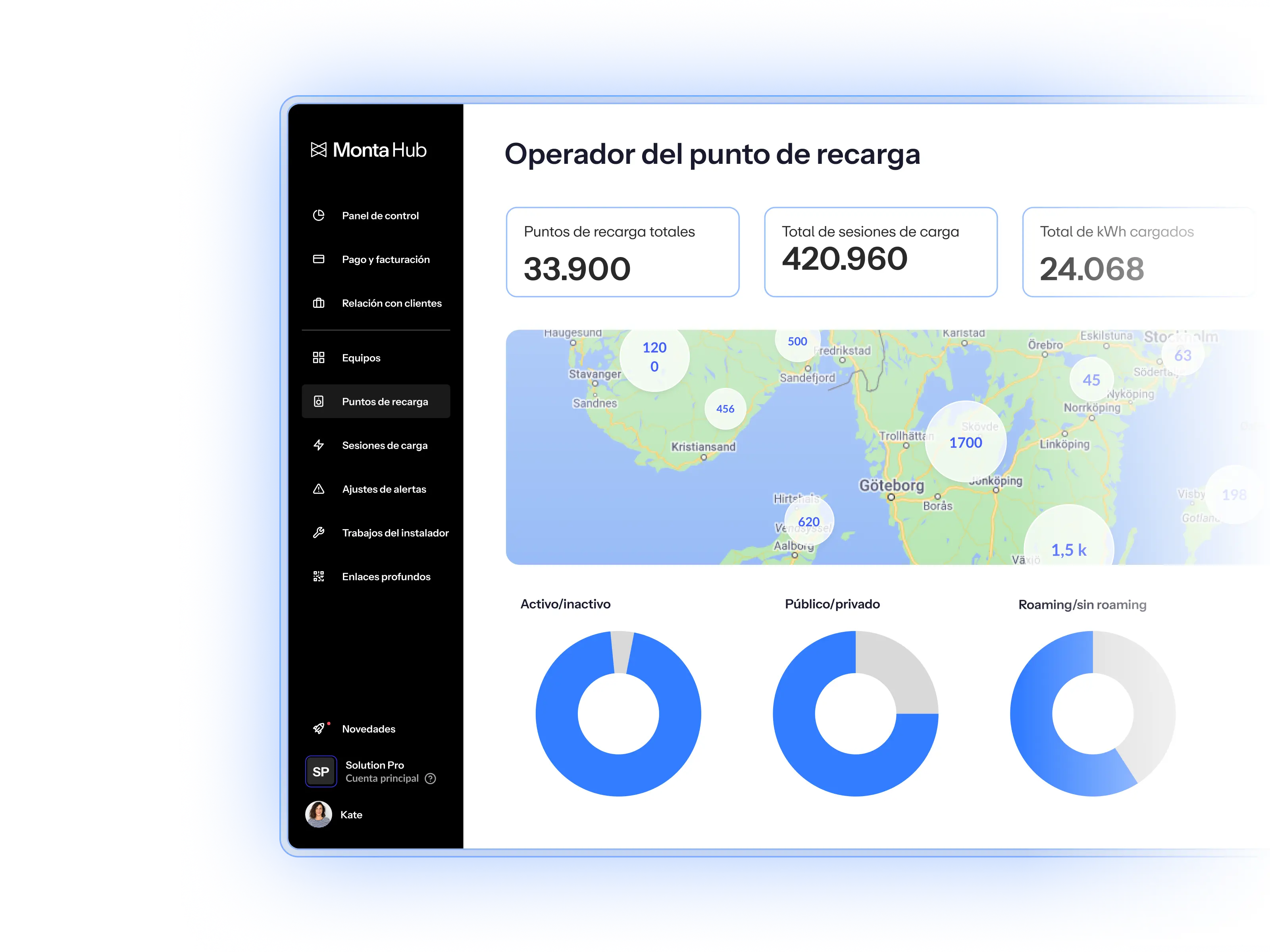 Personaliza y gestiona tu sistema de carga EV exactamente como quieres. Monta Hub es un centro de control único que permite gestionar eficazmente los puntos de recarga, los usuarios, los vehículos y las finanzas, todo en un único lugar.